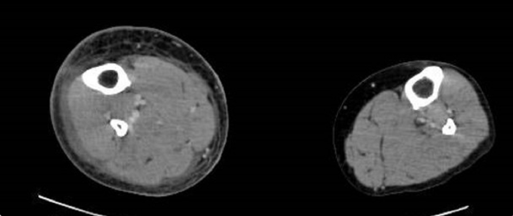 糖尿病の既往あり。昨日より右下腿の発赤、腫脹あり。本日痛みが強く歩けないため救急車にて救急外来を受診した。閉眼しており呼びかけに対して反応が鈍い。両側下腿の造影CT画像を示す